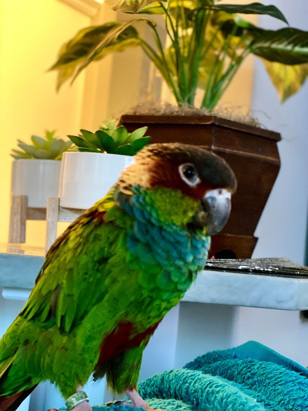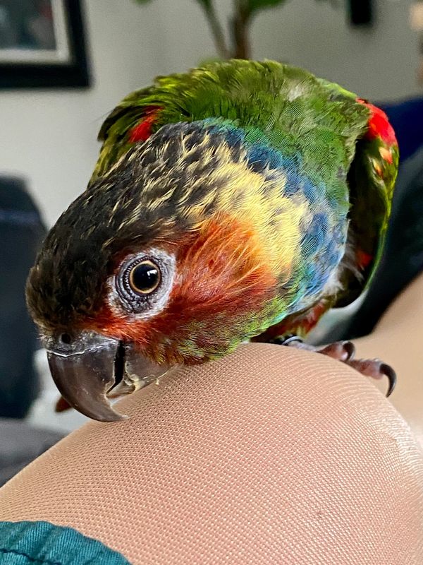 The cool, collected counterpart to Clementine’s chaos. Chianti may come off a bit more serious, but don’t be fooled—this elegant Blue Throated Conure is a total softie when it comes to snacks and one-on-one hangouts. He’s got a regal vibe, a curious heart, and always knows where the treats are hiding.